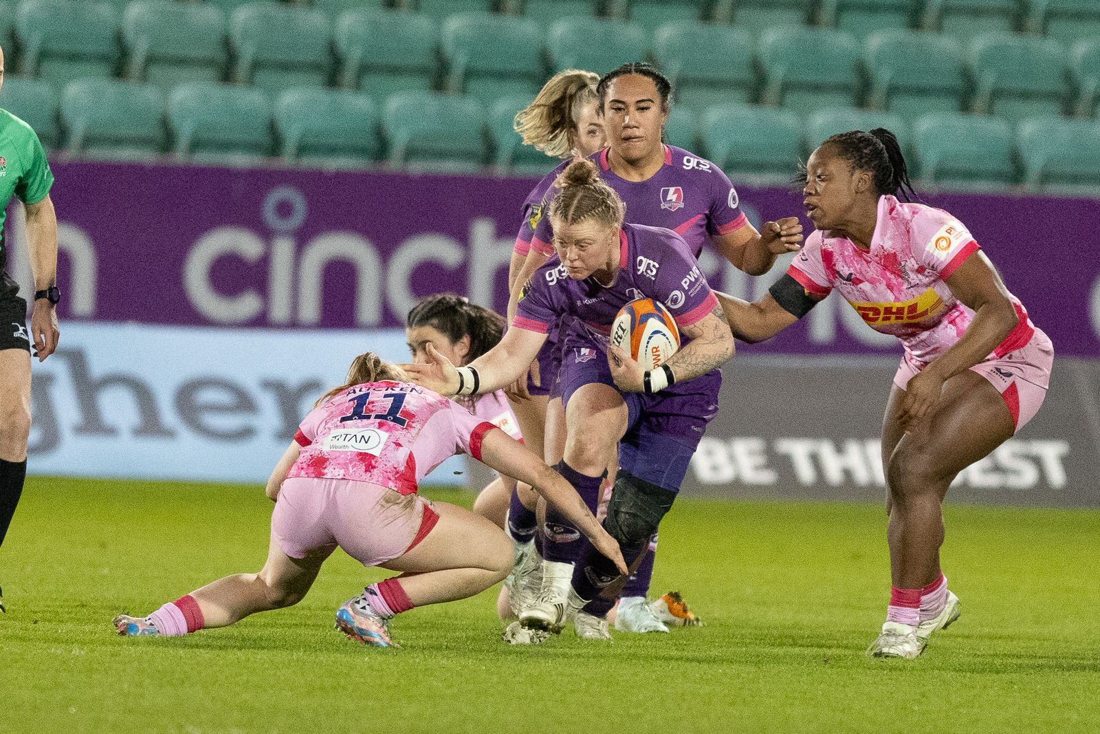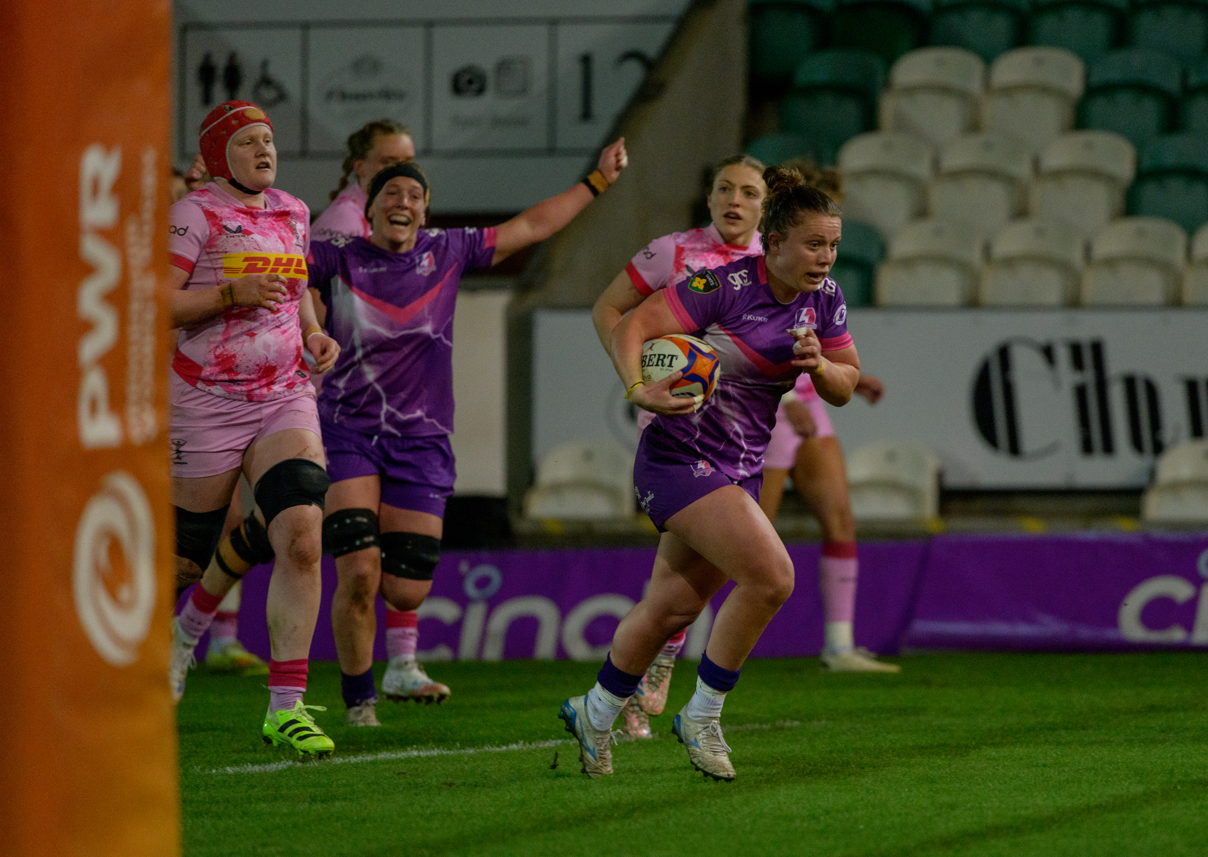 The response from Lightning produced one of their tries of the season. Hibbert-Jones burgled a breakdown just outside her own 22, Rachel Ehrecke teased a tempting ball out in front of Westcombe-Evans, as the winger set off down the left wing before putting in a grubber and racing to within 15 metres of the line, where Maude was on hand to scoop up from the base of the resulting ruck to finish.