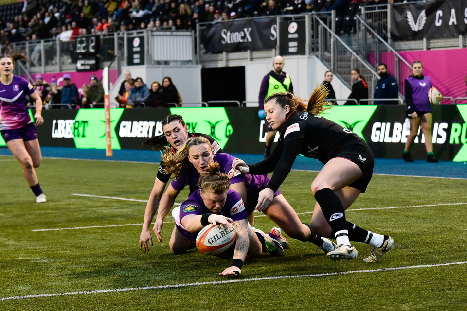 It was Saracens who registered the first points of the game on the 15-minute mark. From close range, a quickly-tapped penalty from Harrison took the defence by surprise and the Red Roses international dived over and then converted her own score.