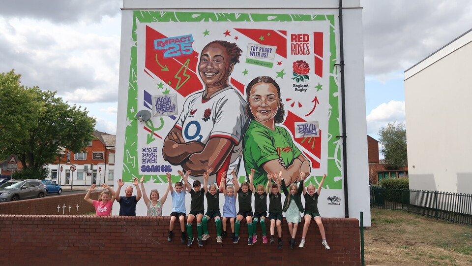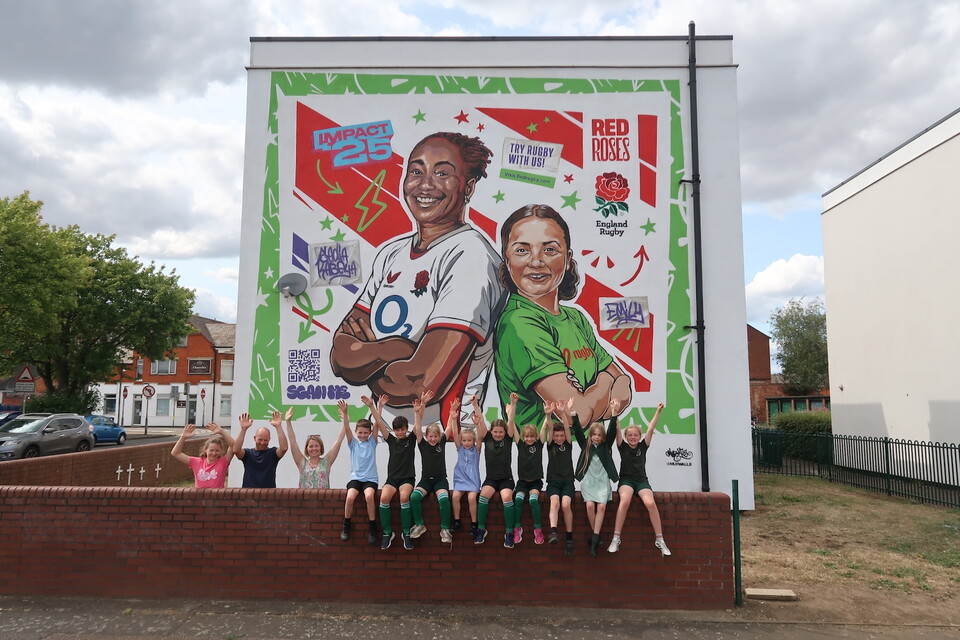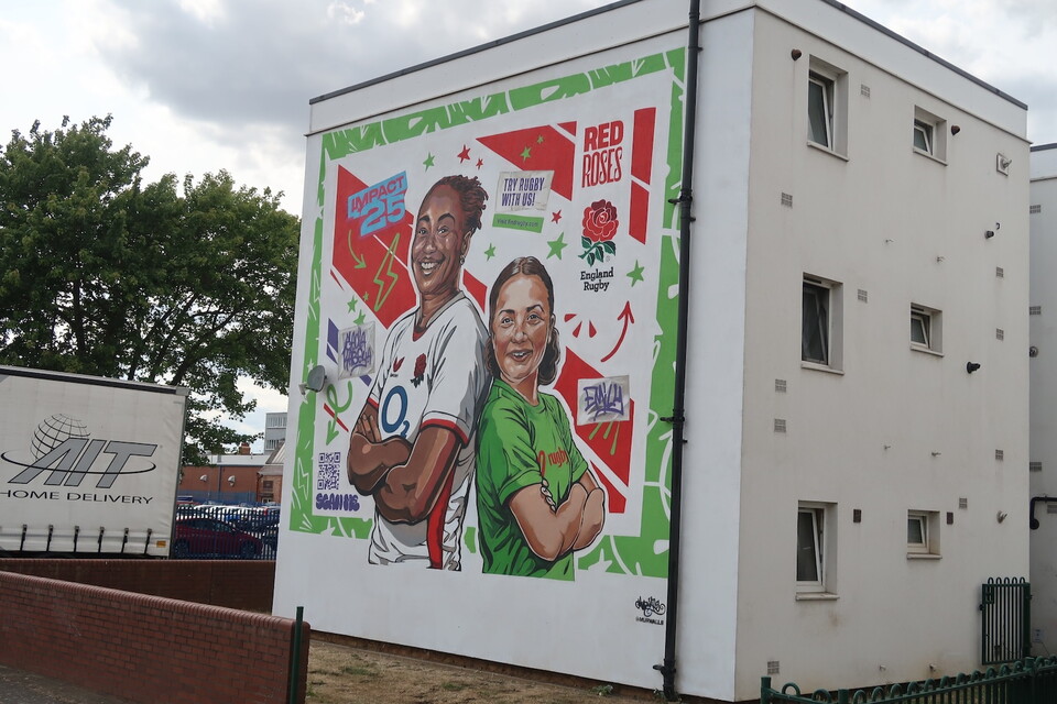 Commissioned by the Rugby Football Union (RFU) and funded through its Impact ’25 legacy programme, the artwork features Red Roses and Loughborough Lightning flanker Sadia Kabeya, alongside nine‑year‑old local player Emily Richards.