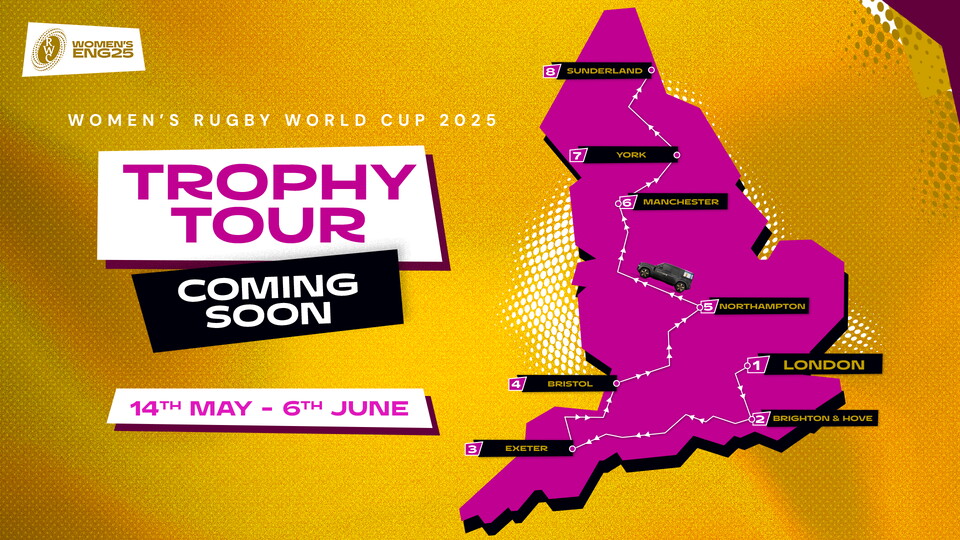Women’s Rugby World Cup trophy will embark on three-week tour of England across May and June, connecting with fans and local communities in all eight RWC 2025 host locations.